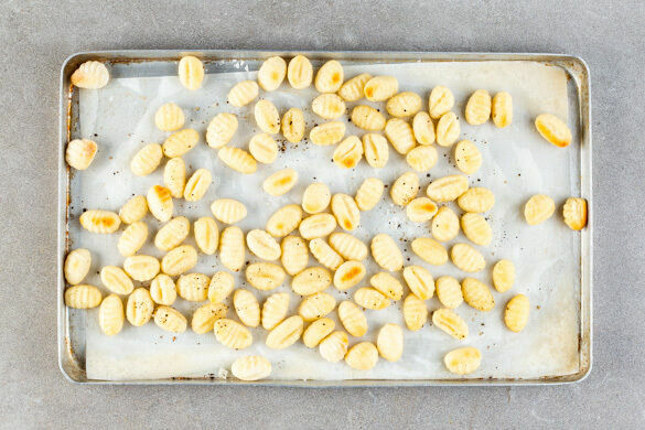 Die Gnocchi auf einem mit Backpapier ausgelegten Backblech mit 2EL Olivenöl und 1 Prise Pfeffer vermengen, gleichmäßig verteilen und 15Min. im Ofen backen. Anschließend den Ofen auf Grillfunktion umstellen und die Gnocchi noch 5min. im Ofen lassen, bis sie goldgelb und knusprig sind.