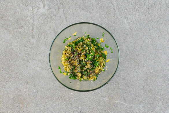 Die Petersilie samt Stängeln fein hacken und mit den restlichen Oliven, 1EL Olivenöl, 1TL Essig und 1 Prise Pfeffer vermengen.