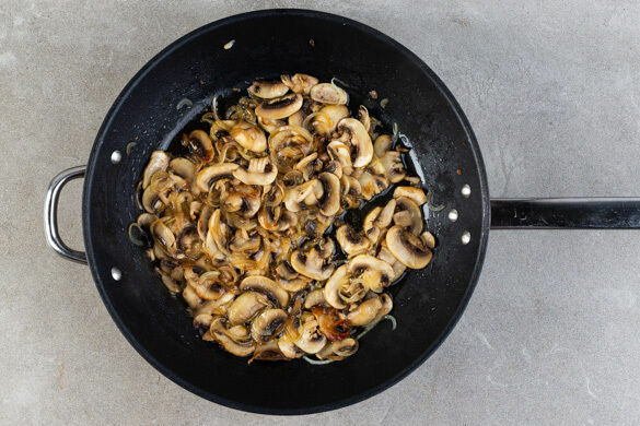 Die Pilze und die Zwiebeln in einer großen Pfanne mit 2EL Olivenöl bei starker Hitze 2–3Min. anbraten. Währenddessen das Fleisch mit etwas Küchenkrepp trocken tupfen.