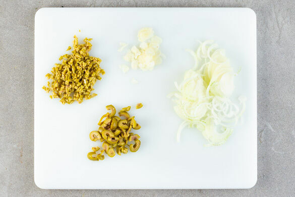Den Backofen auf 200°C Umluft vorheizen. Die 1/2 der Oliven fein, die restlichen Oliven grob hacken. Die Zwiebeln schälen, halbieren und in feine Streifen schneiden. Den Knoblauch schälen und in feine Scheibchen schneiden.