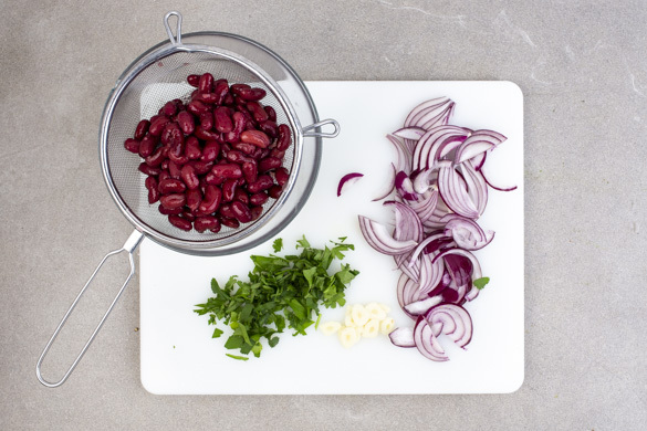 Die Zwiebeln in einer. mittelgroßen Pfanne mit 1EL Olivenöl ca. 1Min. anbraten. Mit den Tomaten ablöschen, dann die Bohnen und die ½ des Brühgewürzes unterrühren und alles 3–4Min. köcheln lassen.