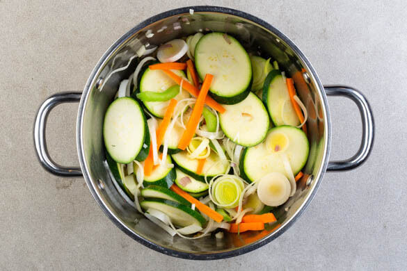 In einem Wasserkocher 2L Wasser zum Kochen bringen. Währenddessen die Zucchini quer in 0,5cm Scheiben schneiden. Den Sellerie in dünne Scheiben schneiden. Die Schalotten schälen, halbieren und grob würfeln. Den Knoblauch schälen und in feine Scheibchen schneiden.