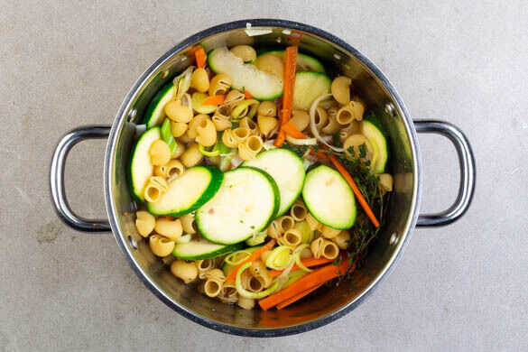 Den Sellerie, die Schalotten, den Knoblauch und den Thymian in einem großen Topf mit 2EL Pflanzenöl bei mittlerer Hitze ca. 1Min. anbraten. Den Gemüsemix und die Zucchini hinzugeben und ca. 3Min. weiterbraten.