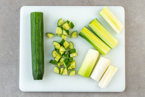 Ca. ¼ jeder Gurke grob würfeln und in ein hohes Gefäß geben. Den Lauch längs halbieren und quer in 8–10cm lange Stücke schneiden.