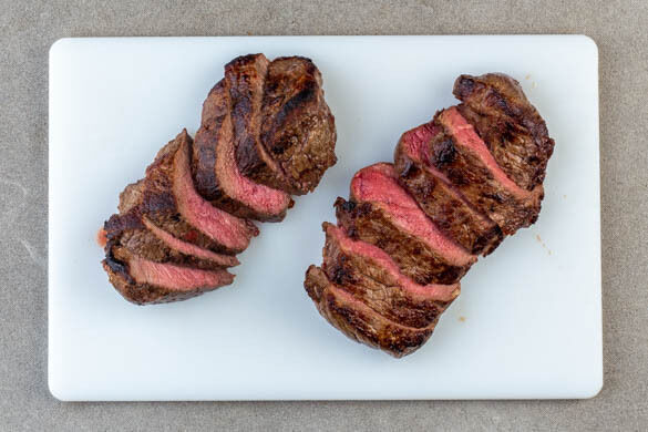Das Fleisch trocken tupfen und in einer großen Pfanne mit 2EL Olivenöl bei starker Hitze auf jeder Seite 2–3Min. braten, abhängig davon, ob es medium oder eher durchgebraten sein soll. Aus der Pfanne nehmen und 5Min. auf einem Teller abgedeckt ruhen lassen.