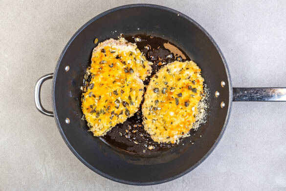 Das Fleisch trocken tupfen, jeweils horizontal halbieren und mit dem Boden einer schweren Pfanne oder einem Fleischkloper flach klopfen. Die Kürbiskerne mit dem Panko-Paniermehl vermengen. 1 Ei mit 1–2EL Wasser verquirlen. Die Schnitzel mit je 1 Prise Salz, Pfeffer und Currypulver würzen und nacheinander in 3EL Mehl, dem Ei und dem Kürbiskern-Panko-Mix wenden.