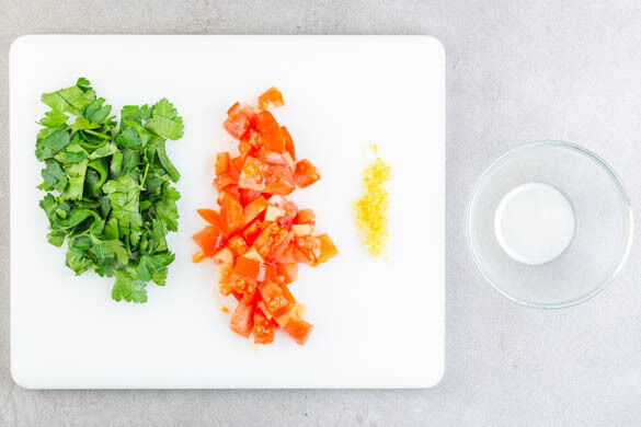 Inzwischen die Zitronenschale abreiben, dann die Zitrone halbieren und auspressen. Die Tomaten in grobe Stücke schneiden. Die Petersilie fein schneiden.