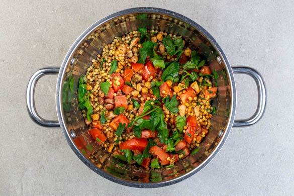 6EL Olivenöl in einem großen Topf bei geringer bis mittlerer Hitze erwärmen. Die Minestrone hinzugeben und ca. 30Sek. anbraten. Dann die Tomaten, die Petersilie und ½TL Salz in den Topf geben, dabei ca. ¼ der Petersilie zum Garnieren reservieren.