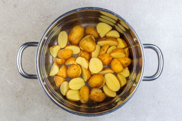 In einem mittelgroßen Topf ausreichend gesalzenes Wasser für die Kartoffeln und die grünen Bohnen zum Kochen bringen. Die Kartoffeln je nach Größe halbieren oder vierteln, dann in das kochende Wasser geben und in 8–10Min. kochen.