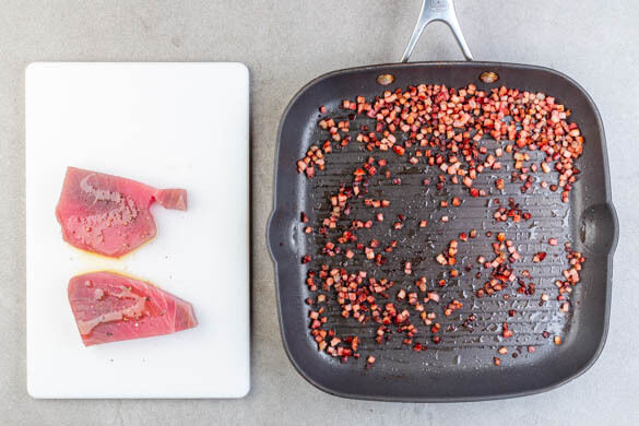 To the hot pan with the bacon fat, add the tuna and grill the fish on a medium-high heat for 2–3min. until the heat reaches a third towards the center of the tuna steaks. You will see the sides of the steaks slowly turning white horizontally. Flip the steaks and repeat the process. If you prefer the fish cooked completely through, just wait for the heat to reach the center before you flip.