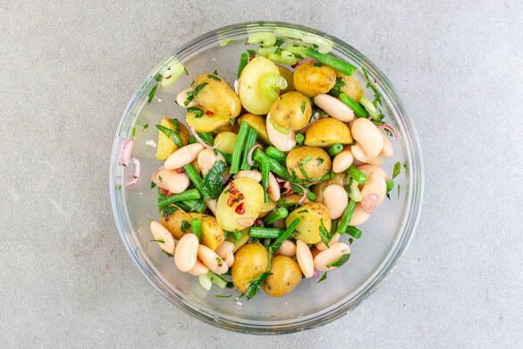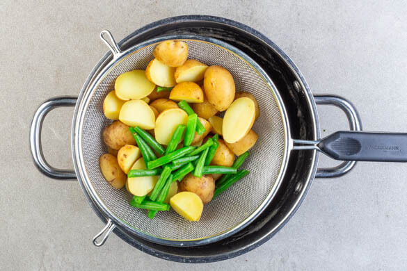Meanwhile, trim off the woody ends of the beans and cut the beans into ca. 2cm pieces. When the potatoes have cooked for 8–10min, add the green beans to the pot and continue cooking for another 10–12min. until the potatoes and beans are fork tender. Drain in a sieve.