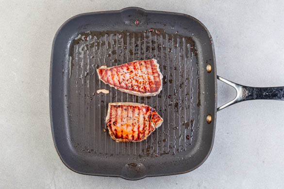 To the hot pan with the bacon fat, add the tuna and grill the fish on a medium-high heat for 2–3min. until the heat reaches a third towards the center of the tuna steaks. You will see the sides of the steaks slowly turning white horizontally. Flip the steaks and repeat the process. If you prefer the fish cooked completely through, just wait for the heat to reach the center before you flip.