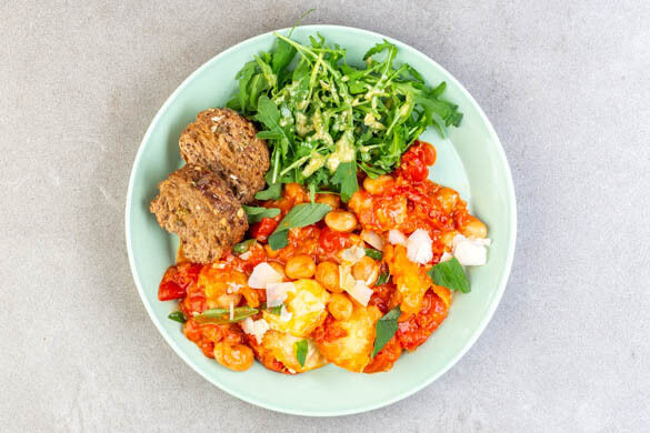 Mozzarella-Bohnen-Pfanne mit Knoblauchbrot und Rucolasalat