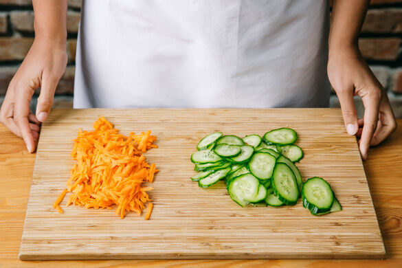 Den Backofen auf 200°C (180°C Umluft) vorheizen. Die Karotte ggf. schälen und mit einer Küchenreibe grob raspeln. Die Gurke schräg in dünne Scheiben schneiden.