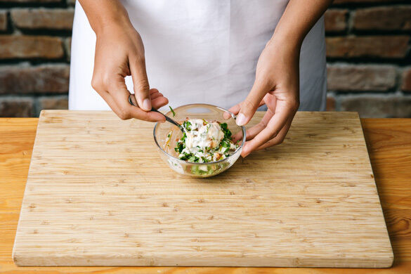 Die Minzeblätter von den Stängeln zupfen und grob schneiden. Den Koriander samt Stängeln ebenfalls grob schneiden und mit der Minze, der Sweet-Chili-Sauce und 2EL Mayonnaise verrühren. Mit Salz und Pfeffer abschmecken.