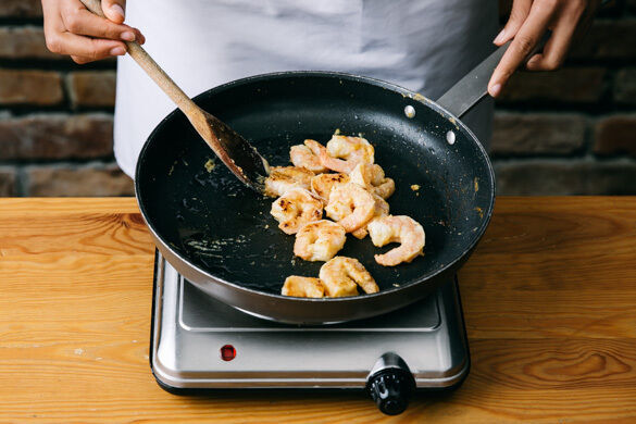 Die Garnelen in einem Sieb kalt abspülen, abtropfen lassen und trocken tupfen, dann in einer mittelgroßen Pfanne mit 1EL Pflanzenöl bei starker Hitze 1–2Min. scharf anbraten. Dann die Sojasauce zugeben und die Garnelen noch ca. 30Sek. weiterbraten.
