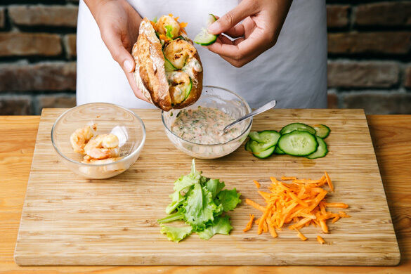 In Vietnam bezeichnet „Bánh mì“ eigentlich Brote aller Art, wird aber am meisten mit Baguette in Verbindung gebracht, das für diesen Streetfood-Klassiker am häufigsten verwendet wird. Es kann mit Fleisch, Fisch oder Gemüse gefüllt werden. Probiere heute unsere Variante mit saftigen Garnelen, knackigem Salat und cremigem Dip!