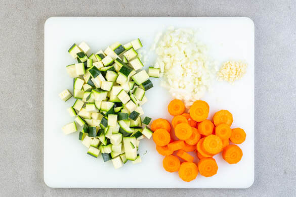 Die Zucchini in ca. 1cm große Würfel schneiden. Die Karotten ggf. schälen und quer in ca. 1cm breite Scheiben schneiden. Den Knoblauch schälen und sehr fein würfeln oder durch eine Knoblauchpresse drücken. Die Zwiebel schälen, halbieren und fein würfeln.
