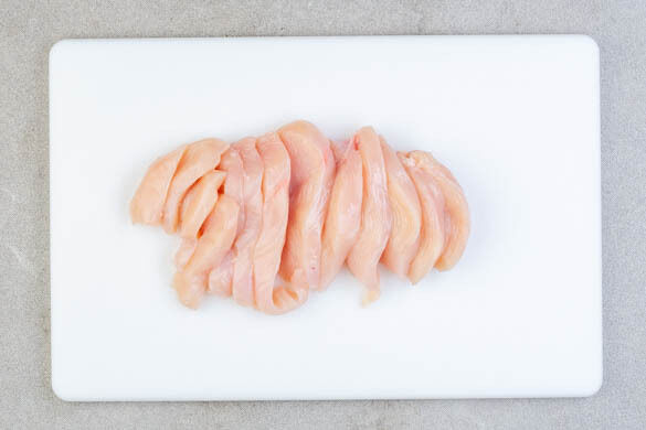 Das Fleisch mit etwas Küchenkrepp trocken tupfen und quer in schmale Streifen schneiden.