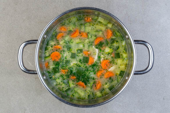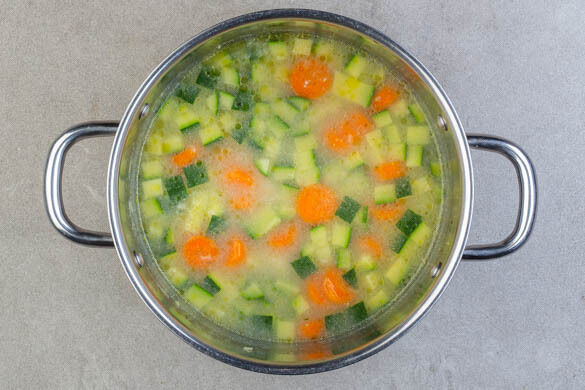 Das Brühgewürz in das kochende Wasser einrühren, die Zwiebeln, die Zucchini, die Karotten und das Fleisch zugeben und die Suppe abgedeckt 12–14Min. köcheln lassen, ggf. die Hitze leicht reduzieren.