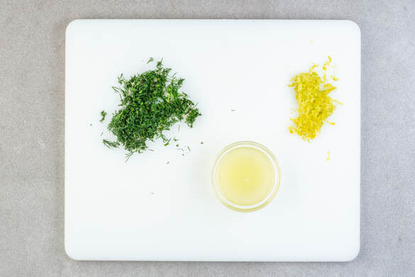 Während die Suppe köchelt, die Zitronenschale abreiben, die Zitrone halbieren und auspressen. Den Dill samt weichen Stängeln fein schneiden.