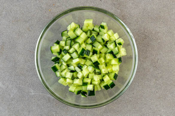 Die Gurke längs vierteln und in kleine Würfel schneiden. In einer Schüssel mit der ½ des Zitronensafts, 1EL Wasser, 1 kräftigen Prise Zucker und 1 Prise Salz marinieren. Ein mit Backpapier ausgelegtes Backblech mit 1EL Pflanzenöl einfetten.
