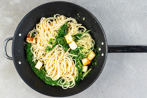 Während die Pasta kocht, den Spinat in einem Sieb mit dem abgekochten Wasser übergießen. Anschließend mit 1–2EL Pflanzenöl in einem hohen Gefäß pürieren. Den Spinat zum Paneer in die Pfanne geben und ca. 1Min. mitgaren. Mit der restlichen Gewürzmischung sowie Salz und Pfeffer abschmecken und die Pfanne vom Herd nehmen.