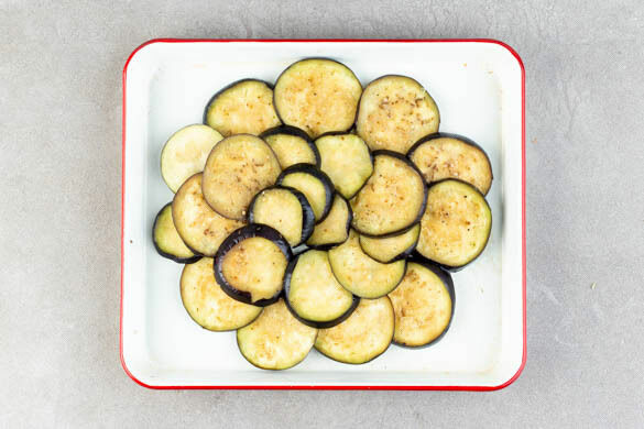 Den Backofen auf 250°C Umluft vorheizen. In einem kleinen Topf 450ml leicht gesalzenes Wasser für die Quinoa zum Kochen bringen. Die Aubergine in ca. 1cm dünne Scheiben schneiden und in einer Auflaufform oder auf einem mit Backpapier ausgelegten Backblech verteilen, die Scheiben dürfen überlappen. Mit 1–2EL Olivenöl beträufeln und 6–7Min. im Ofen vorbacken.