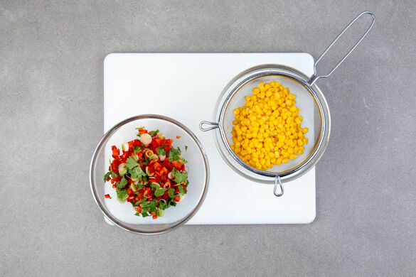 Inzwischen die Paprika halbieren, entkernen und in kleine Würfel schneiden. Die Lauchzwiebel in feine Ringe schneiden, die weißen und grünen Ringe getrennt aufbewahren. Die Korianderblätter abzupfen und grob schneiden. Die Paprika, die weißen Lauchzwiebelringe und den Koriander vermengen. Den Mais in einem Sieb abtropfen lassen.