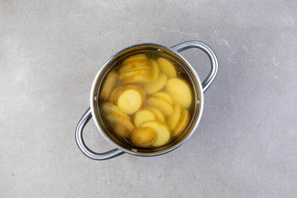 Die Kartoffeln samt Schale in dünne Scheiben schneiden und in einem großen Topf mit gesalzenem Wasser bedecken. Zum Kochen bringen und anschließend noch 6–8Min. kochen lassen, bis die Kartoffeln gar sind. In einem Sieb mit kaltem Wasser abspülen und abtropfen lassen.