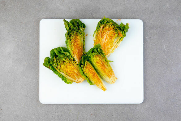 Den Romanasalat mit den Schnittflächen nach unten in einer Grillpfanne oder einer normalen Pfanne bei starker Hitze 1–2Min. goldbraun anbraten. Dann wenden und weitere 1–2Min. braten. Aus der Pfanne nehmen, mit etwas Limettensaft beträufeln und mit etwas Käse bestreuen.