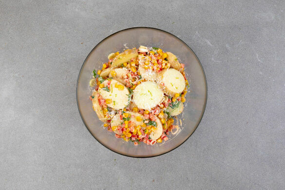 Den Mais in der Pfanne bei mittlerer Hitze 3–4Min. goldbraun anbraten. Die Kartoffeln mit dem Mais, dem Paprika-Mix und dem Dressing vorsichtig vermengen. Den Kartoffel-Mais-Salat mit den Romanaherzen anrichten mit den restlichen Lauchzwiebeln und dem restlichen Käse garnieren und servieren.