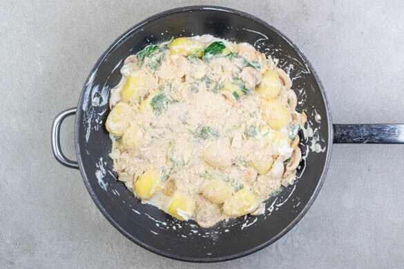 Die Käse-Brösel-Mischung gleichmäßig auf den Gnocchi verteilen und die Gnocchi im Ofen in 3–5Min. goldbraun überbacken. Auf Teller verteilen und servieren.