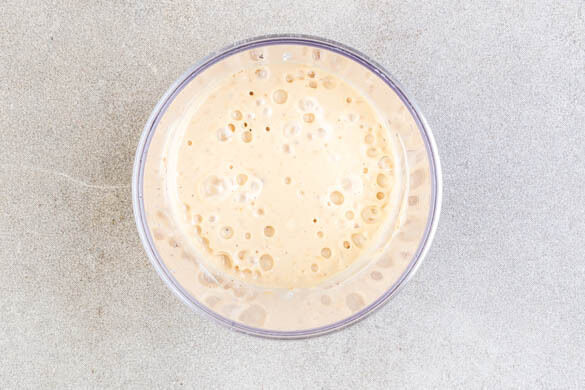 Das Tahini mit 2EL Zucker, 3EL Sesam, 4EL veganer Mayonnaise, 4EL Essig, 120ml Wasser, der restlichen Sojasauce, dem restlichen Sesamöl und je ½TL Salz und Pfeffer in einem hohen Gefäß glatt pürieren. Je nach gewünschter Konsistenz ggf. esslöffelweise mehr Wasser hinzugeben. Das Dressing sollte cremig und gießfähig sein. Mit Salz, Essig und Zucker abschmecken.