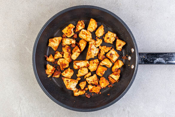 Die Quinoa mit einer Gabel auflockern und etwas abkühlen lassen. Den Tofu in einer mittelgroßen Pfanne mit 1EL Pflanzenöl bei mittlerer Hitze in 4–6Min. rundum goldbraun braten. Dann vom Herd nehmen.