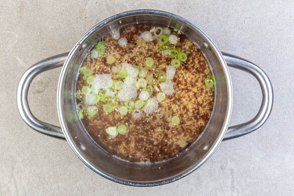 Die Lauchzwiebel in feine Ringe schneiden. Die weißen Lauchzwiebelringe in einem kleinen Topf mit ½EL Pflanzenöl ca. 1Min. anbraten. 350ml leicht gesalzenes Wasser hinzugeben und aufkochen. Die Quinoa in einem feinmaschigen Sieb mit warmem Wasser abspülen, ins kochende Wasser geben und 15–20Min. abgedeckt bei niedriger Hitze sanft köcheln lassen. Dann abgedeckt ruhen lassen.