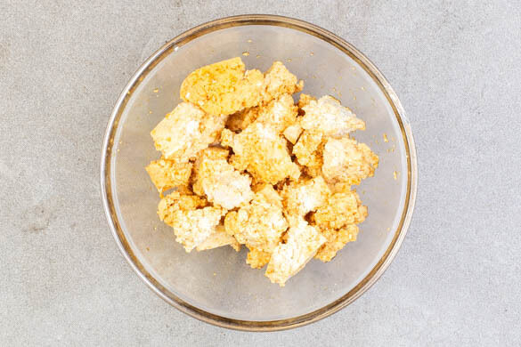 Den Tofu mit Küchenkrepp sanft auspressen und in mundgerechte Stücke brechen. 20ml Sojasauce mit der ½ des Sesamöls verrühren, dann die Sauce mit dem Tofu vermengen und den Tofu marinieren lassen.