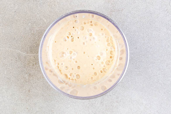 Das Tahini mit 1EL Zucker, 1½EL Sesam, 2EL veganer Mayonnaise, 2EL Essig, 4EL Wasser, der restlichen Sojasauce, dem restlichen Sesamöl und je 1 kräftige Prisen Salz und Pfeffer in einem hohen Gefäß glatt pürieren. Je nach gewünschter Konsistenz ggf. esslöffelweise mehr Wasser hinzugeben. Das Dressing sollte cremig und gießfähig sein. Mit Salz, Essig und Zucker abschmecken.