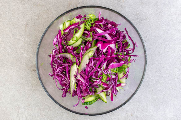 Die Gurke längs halbieren und schräg in dünne Scheiben schneiden. Den Rotkohl in feine, mundgerechte Streifen schneiden. Beides mit den grünen Lauchzwiebelringen in eine große Schüssel geben.