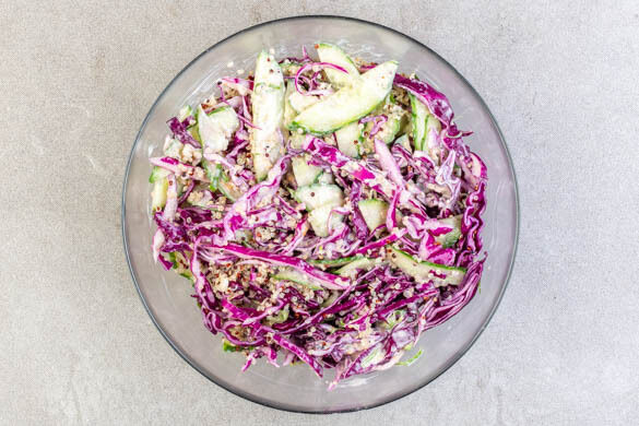 Die Quinoa zur Gurken-Rotkohl-Mischung in die Schüssel geben und mit ausreichend Dressing vermengen, sodass alles gut überzogen ist. Den Quinoasalat in Schalen oder auf tiefen Tellern anrichten und mit dem Tofu belegen. Mit dem restlichen Dressing beträufeln und mit dem restlichen Sesam garniert servieren.