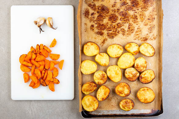 Nach ca. 15Min. Backzeit den Knoblauch vom Blech nehmen, das restliche Gemüse zurück in den Ofen geben und weitere 5–10Min. backen, bis die Karotten weich und gebräunt sind. Die Karotten vom Blech nehmen und die Kartoffeln weitere 5–10Min. rösten, bis sie weich genug sind, dass sie sich leicht mit einem Messer einstechen lassen.