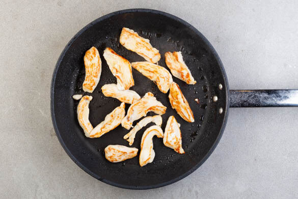 Das Fleisch mit etwas Küchenkrepp trocken tupfen und in breite Streifen schneiden. In einer großen Pfanne mit 3EL Pflanzenöl bei starker Hitze in 4–6Min. rundum goldbraun und gar braten, mit 1½TL Salz würzen.