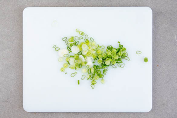 Die Lauchzwiebeln in feine Ringe schneiden.