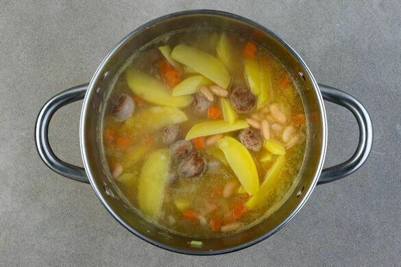 Die Wurst und die Zwiebeln in einem mittelgroßen Topf mit 2EL Butter bei mittlerer Hitze 2–3Min. anbraten. Die Karotten und die Selleriewürfel dazugeben und mit 1,5L Wasser ablöschen. Die Flüssigkeit zum Kochen bringen und das Brühgewürz einrühren, dann die Kartoffeln in den Topf geben und den Eintopf 15–20Min. köcheln lassen. Anschließend die Bohnen hinzufügen.