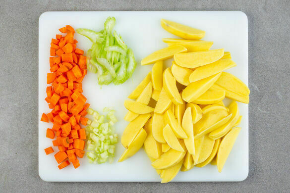 Die Kartoffeln schälen und in ca. 1cm dicke Spalten schneiden. Die ½ des Selleries in sehr kleine Würfel, den restlichen Sellerie schräg in hauchdünne Scheiben schneiden. Die Karotten ggf. schälen, längs vierteln und in kleine Würfel schneiden.
