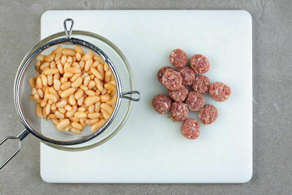 Die Wurst in ca. 1cm breite Scheiben schneiden. Die Bohnen in ein Sieb abgießen, kalt abspülen und abtropfen lassen.