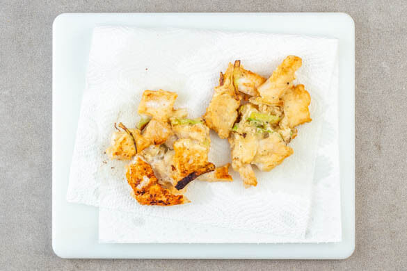 In einer großen Pfanne 2EL Pflanzenöl bei mittlerer bis starker Hitze erwärmen. Die ½ der Fischstücke mit dem Teig in einer einzigen Schicht in die Pfanne geben, in zwei pfannkuchenartigen Hälften teilen und 3–4Min. braten, dann wenden und erneut in 3–4Min. goldbraun und gar weiterbraten. Auf Küchenpapier abtropfen lassen, während der Vorgang mit dem restlichen Fisch wiederholt wird.