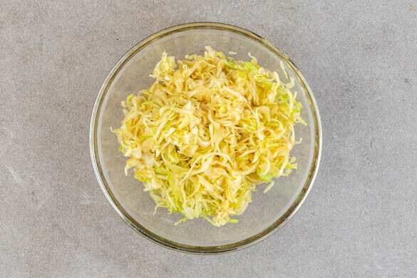 Den Backofen auf 220°C (200°C Umluft) vorheizen. Die ½ der Sojasauce und 1EL Essig mit je 1 Prise Zucker und Salz verrühren. Den Weißkohl 1–2Min. gründlich mit dem Dressing verkneten.
