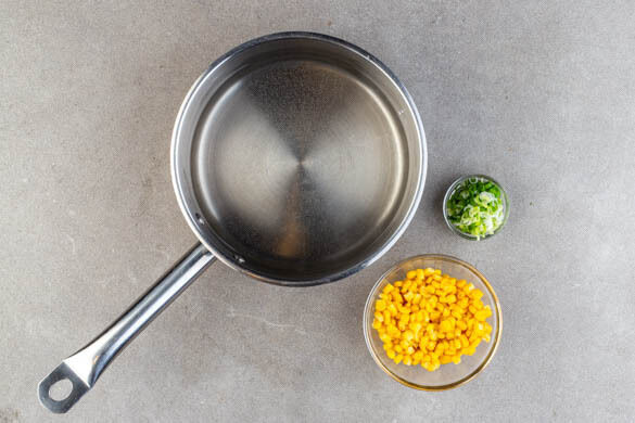 Einen mittelgroßen Topf ca. 1cm hoch mit Wasser befüllen und das Wasser zum Kochen bringen. Die Lauchzwiebel längs halbieren und quer in feine Streifen schneiden. Den Mais in ein Sieb abgießen und abtropfen lassen.