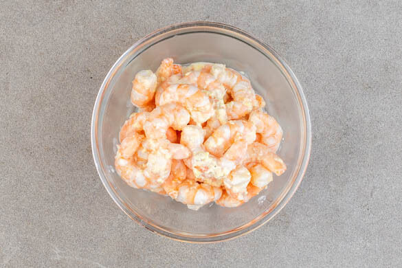 Die Garnelen in einem Sieb mit kaltem Wasser abspülen, in das kochende Wasser geben und bei mittlerer bis starker Hitze 1–2Min. köcheln, bis sie rosa und durchgegart sind. In ein Sieb abgießen, trocken tupfen und mit der Ingwercreme vermengen.